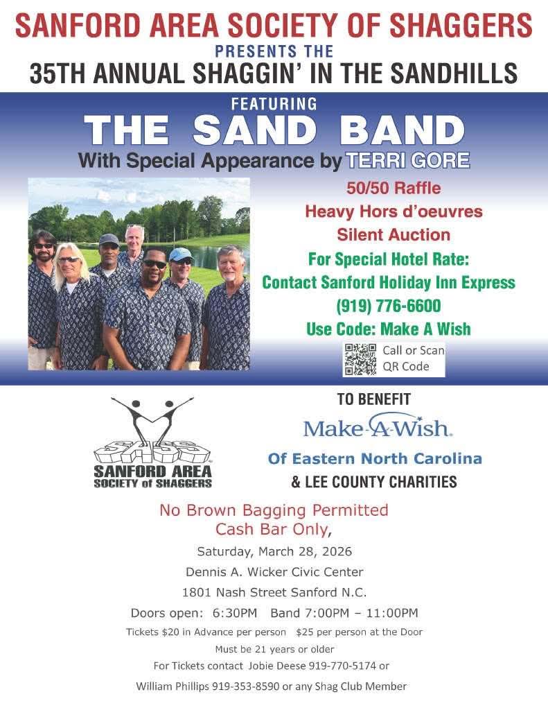 Tickets cost $20.00. This event includes a 50/50 Raffle, heavy Hors d’oeuvres and a silent auction. For a special hotel rate contact Sanford Holiday Inn Express at 919-776-6600. For more information contact Jobie Deese at 919-770-5174.